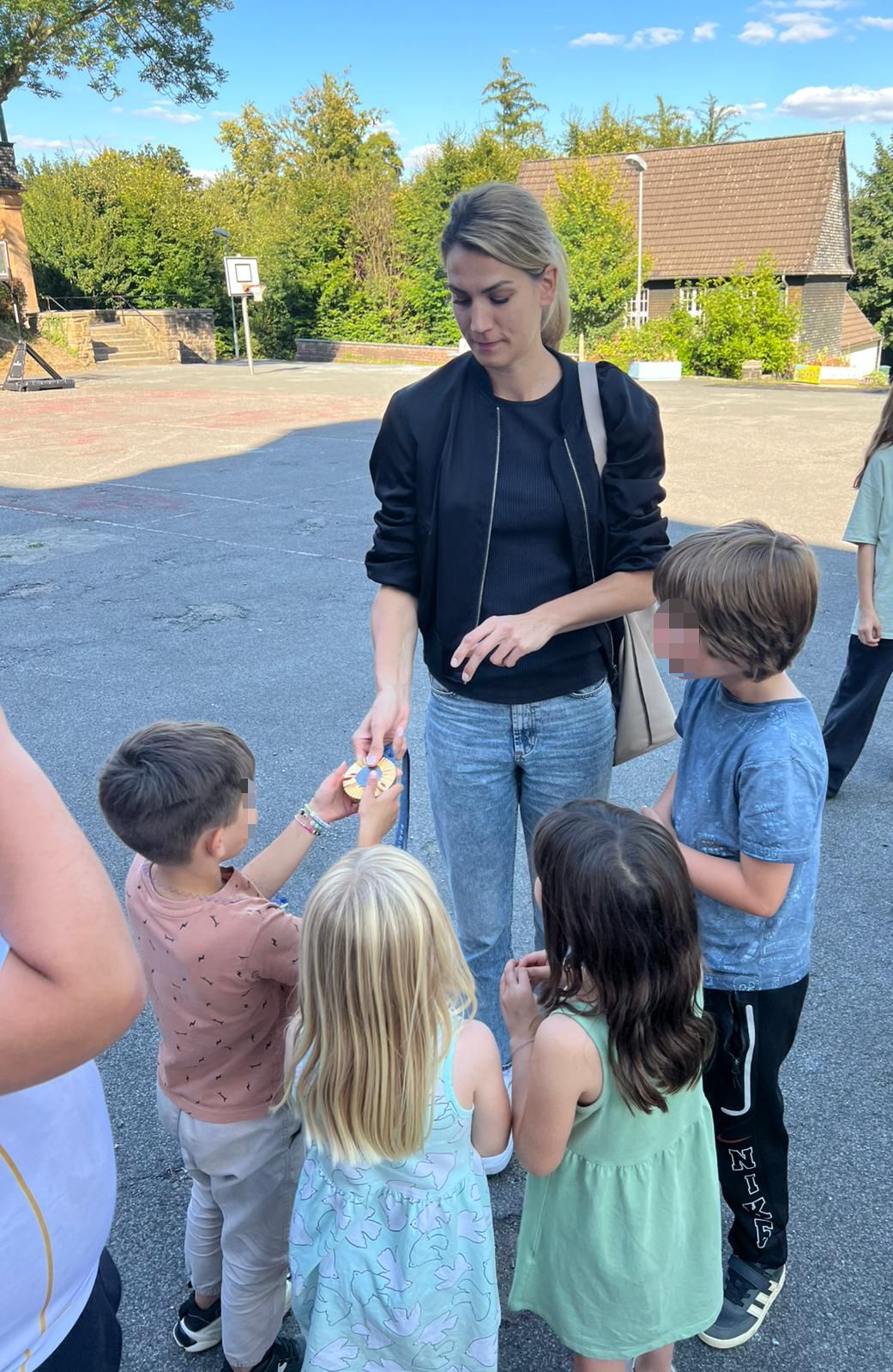 Zusammen mit Schirmherrin Sonja Greinacher haben wir am 21.08. die Körbe übergeben und das war noch nicht alles! Sonja hatte ihre Olympiagoldmedaille dabei